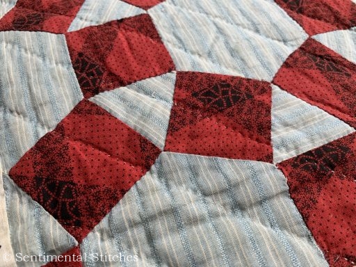 The fabrics used are the same red as the sashing fabric and a textured blue shirt stripe. It's a pretty block but I'm happy with the simplified version.