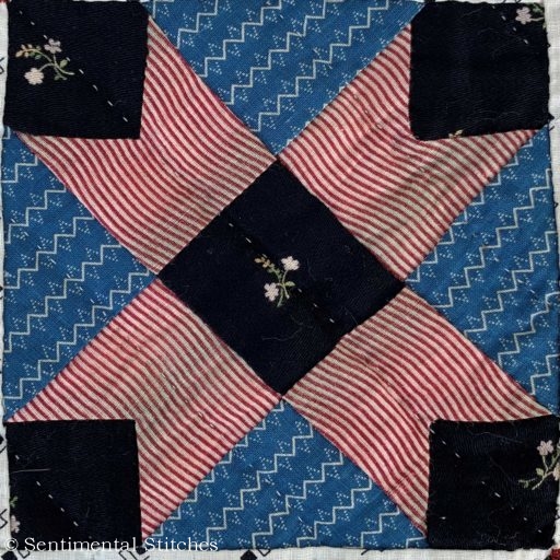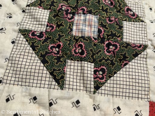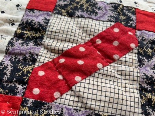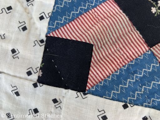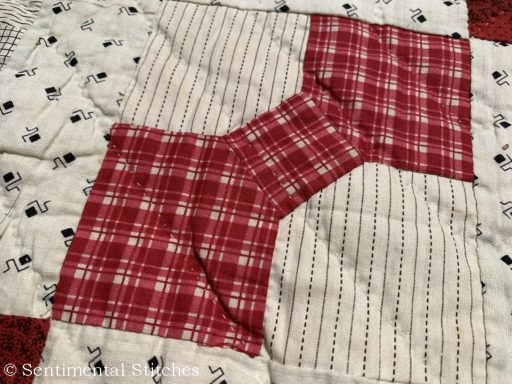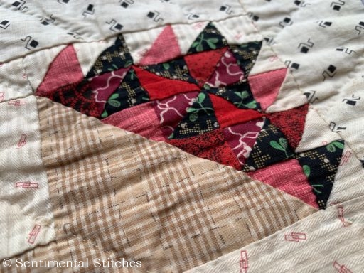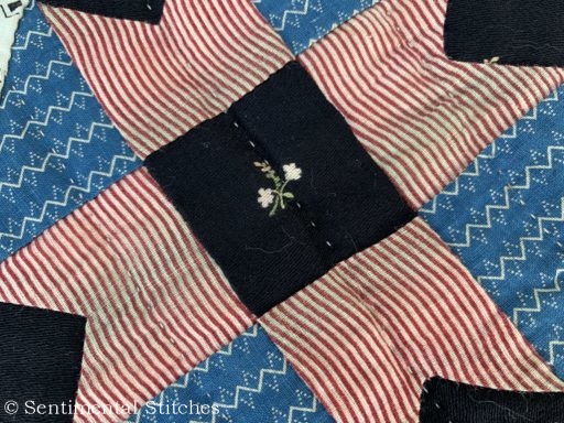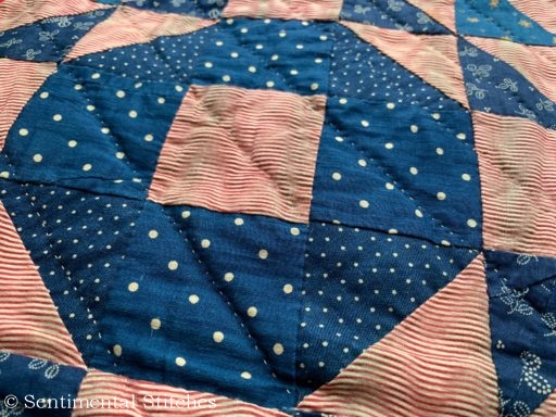 The minute I took it out of the box, I knew there was something very special about this quilt! There was not one machine stitch in the entire quilt! The border strips were even sewn on by hand as was the tiny pink binding.