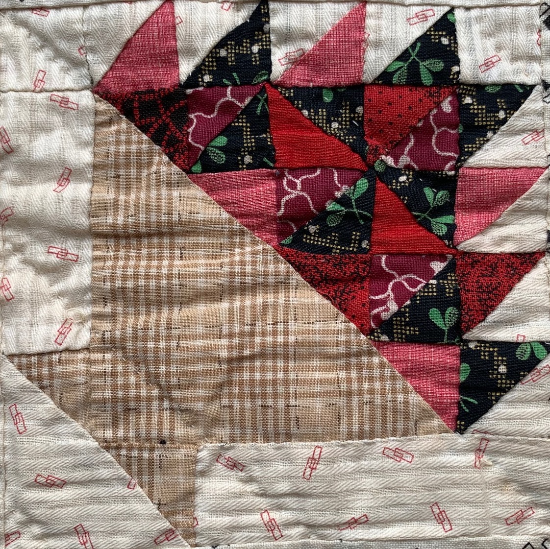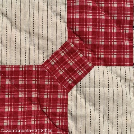 Look at this quilting - look at it again - and again. Those are the tiniest stitches I have ever seen in a quilt. That cross hatch is about 1" square and I counted 16 stitches to the inch in several places. I couldn't achieve that in three lifetimes of hand quilting. Yes, there is batting in the quilt! So much for a machine sewn quilt!!!