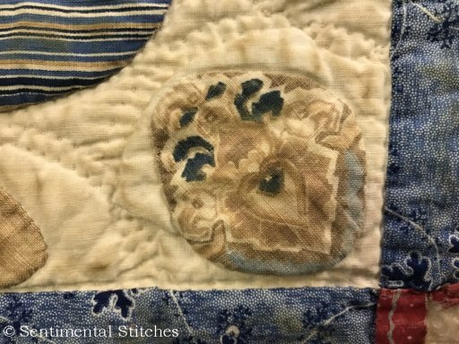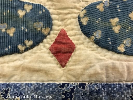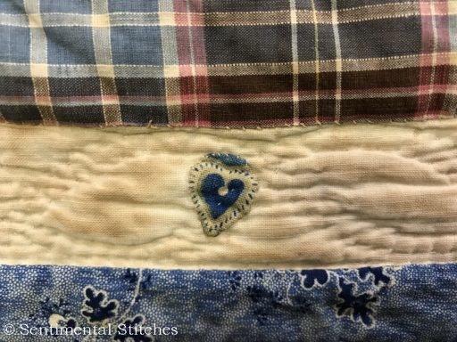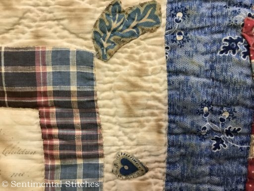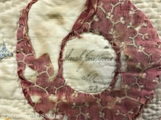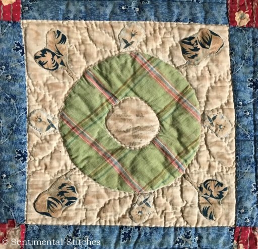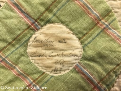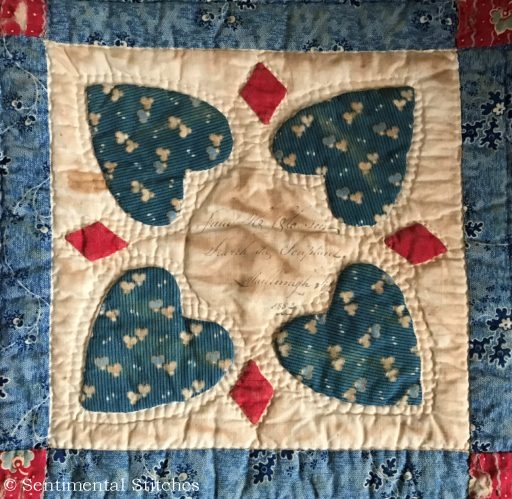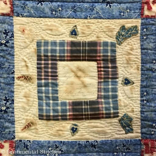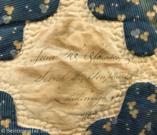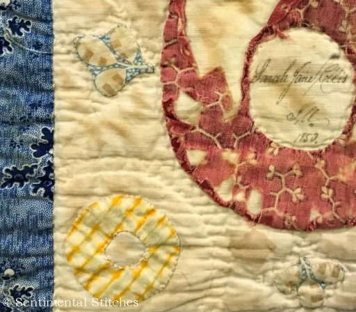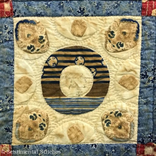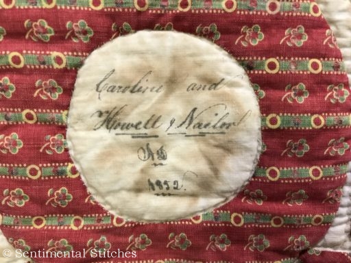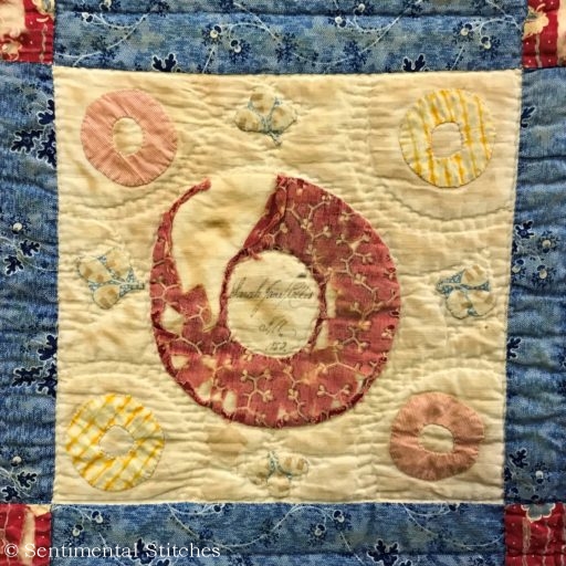 Many of the blocks have sentiments inked on them for the Sarah and Maxon. Some have just the name and date like the today's blocks. I've been writing down inscriptions as I come across them. If you'd like to use them on your quilt, you can download a copy of the first group - Antique Quilt Inscriptions 1 I may print some of them on extra pieces of fabric and sneak them under the center of a blocks motif so they're sewn in place when I do the reverse applique in that area (like under the center of the donut in the picture above.