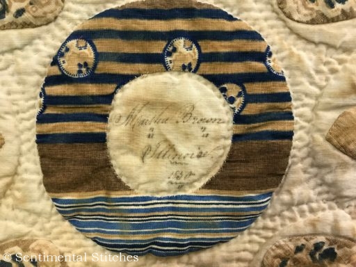 I have so much to tell you I'm not sure where to start. This is a long post with lots of pictures and information. If you haven't read the introduction post for this quilt you might want to take a few minutes to do that. I believe the quilt was made for Sarah and Maxon Dunham by family and friends.